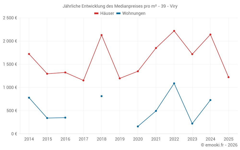 Der Durchschnittspreis auf den 14 Hausgeschäften der letzten 24 Monate in der Gemeinde Viry betrug 1 513 € pro Quadratmeter für einen mittleren Immobilienwert von 235 000 €. Über diesen Zeitraum hinweg lagen 60% der Transaktionen zwischen 1 096 und 2 418 € pro Quadratmeter (vom 2. bis zum 8. Dezil).