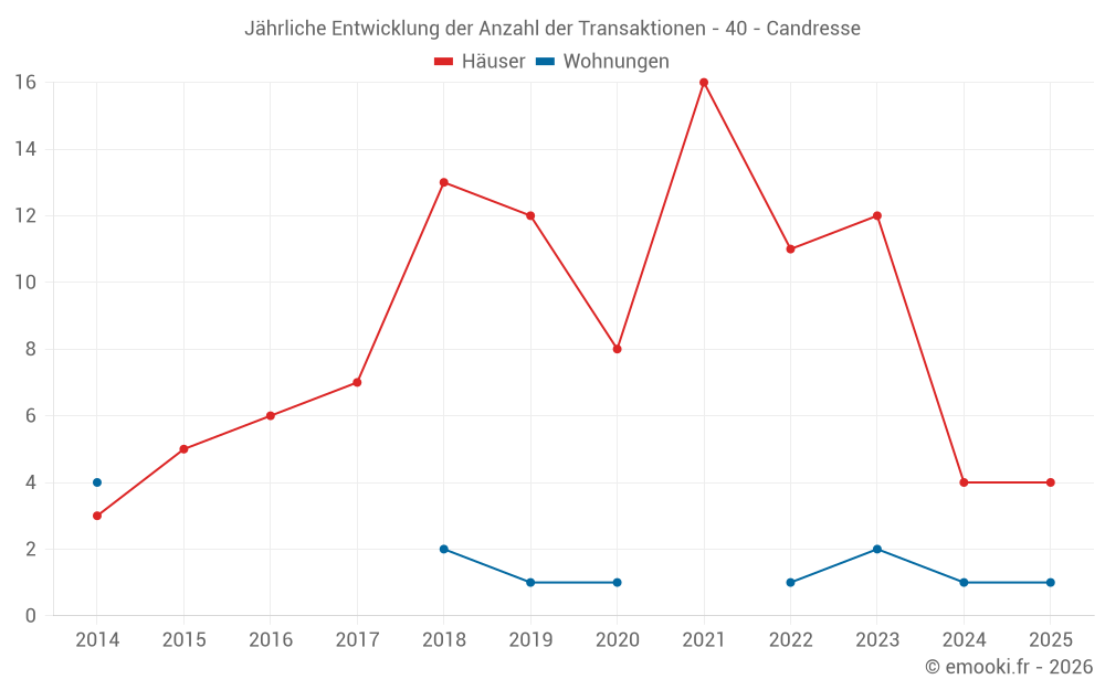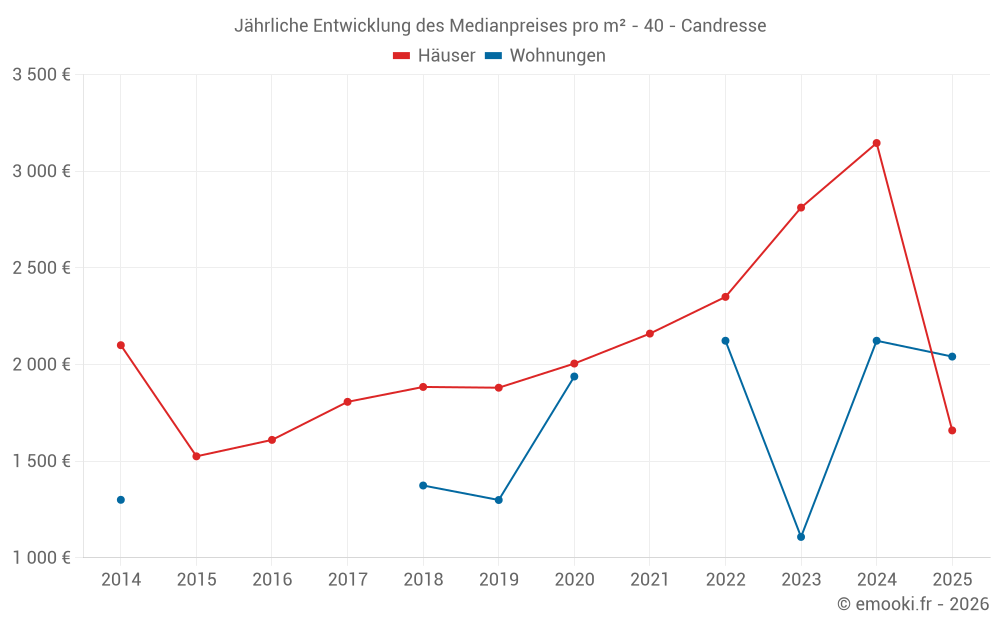 Der Durchschnittspreis auf den 16 Hausgeschäften der letzten 24 Monate in der Gemeinde Candresse betrug 2 872 € pro Quadratmeter für einen mittleren Immobilienwert von 293 049 €. Über diesen Zeitraum hinweg lagen 60% der Transaktionen zwischen 1 928 und 3 045 € pro Quadratmeter (vom 2. bis zum 8. Dezil).