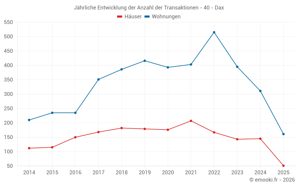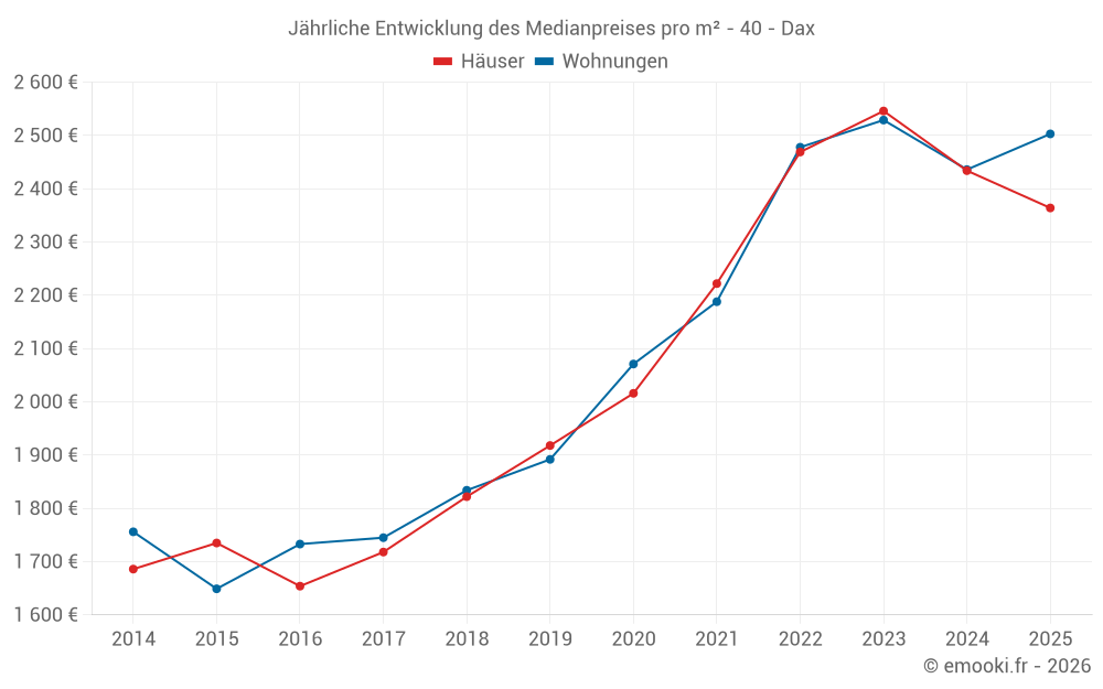 Der Durchschnittspreis auf den 80 Wohnungstransaktionen der letzten 3 Monate in der Gemeinde Dax betrug 2 574 € pro Quadratmeter für einen mittleren Immobilienwert von 114 500 €. Über diesen Zeitraum hinweg lagen 60% der Transaktionen zwischen 2 135 und 2 894 € pro Quadratmeter (vom 2. bis zum 8. Dezil).