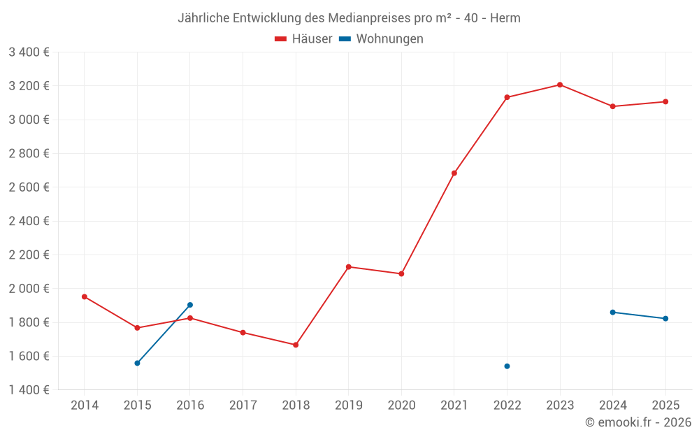 Der Durchschnittspreis auf den 17 Hausgeschäften der letzten 12 Monate in der Gemeinde Herm betrug 3 084 € pro Quadratmeter für einen mittleren Immobilienwert von 290 000 €. Über diesen Zeitraum hinweg lagen 60% der Transaktionen zwischen 2 680 und 3 258 € pro Quadratmeter (vom 2. bis zum 8. Dezil).