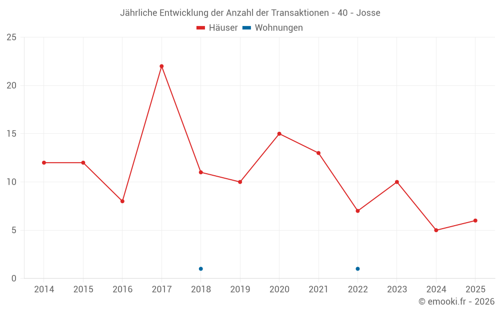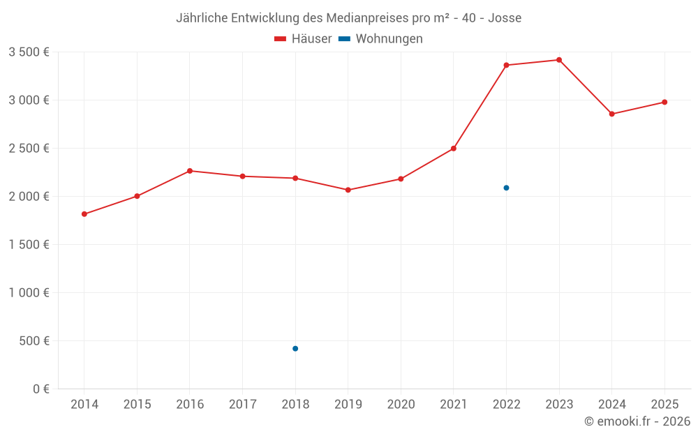 Der Durchschnittspreis auf den 15 Hausgeschäften der letzten 24 Monate in der Gemeinde Josse betrug 3 050 € pro Quadratmeter für einen mittleren Immobilienwert von 300 000 €. Über diesen Zeitraum hinweg lagen 60% der Transaktionen zwischen 2 348 und 3 363 € pro Quadratmeter (vom 2. bis zum 8. Dezil).