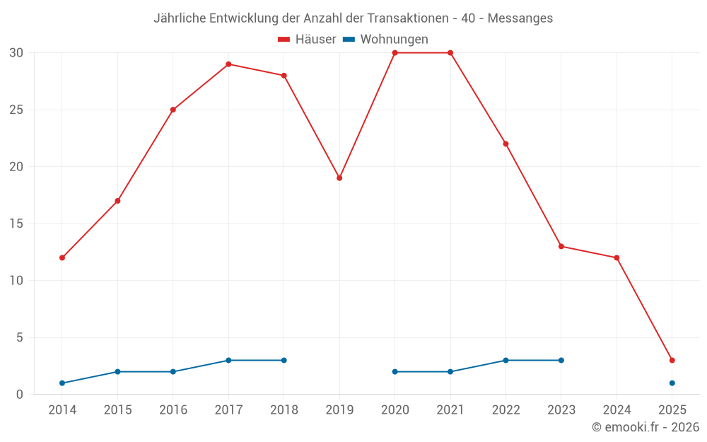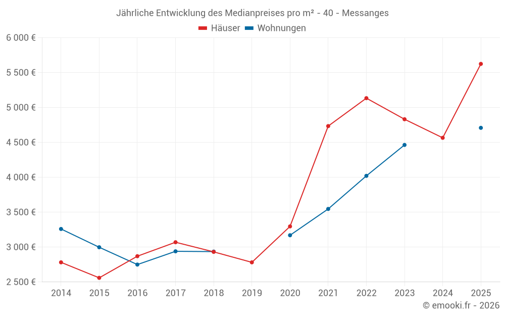 Der Durchschnittspreis auf den 21 Hausgeschäften der letzten 24 Monate in der Gemeinde Messanges betrug 4 761 € pro Quadratmeter für einen mittleren Immobilienwert von 445 000 €. Über diesen Zeitraum hinweg lagen 60% der Transaktionen zwischen 3 732 und 6 061 € pro Quadratmeter (vom 2. bis zum 8. Dezil).