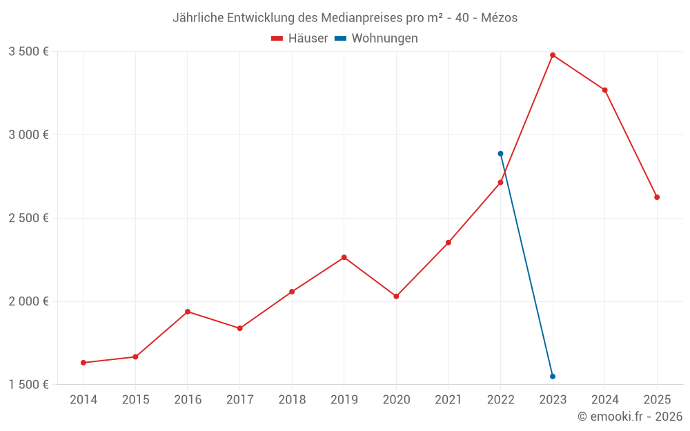 Der Durchschnittspreis auf den 23 Hausgeschäften der letzten 24 Monate in der Gemeinde Mézos betrug 3 132 € pro Quadratmeter für einen mittleren Immobilienwert von 277 000 €. Über diesen Zeitraum hinweg lagen 60% der Transaktionen zwischen 1 766 und 3 595 € pro Quadratmeter (vom 2. bis zum 8. Dezil).