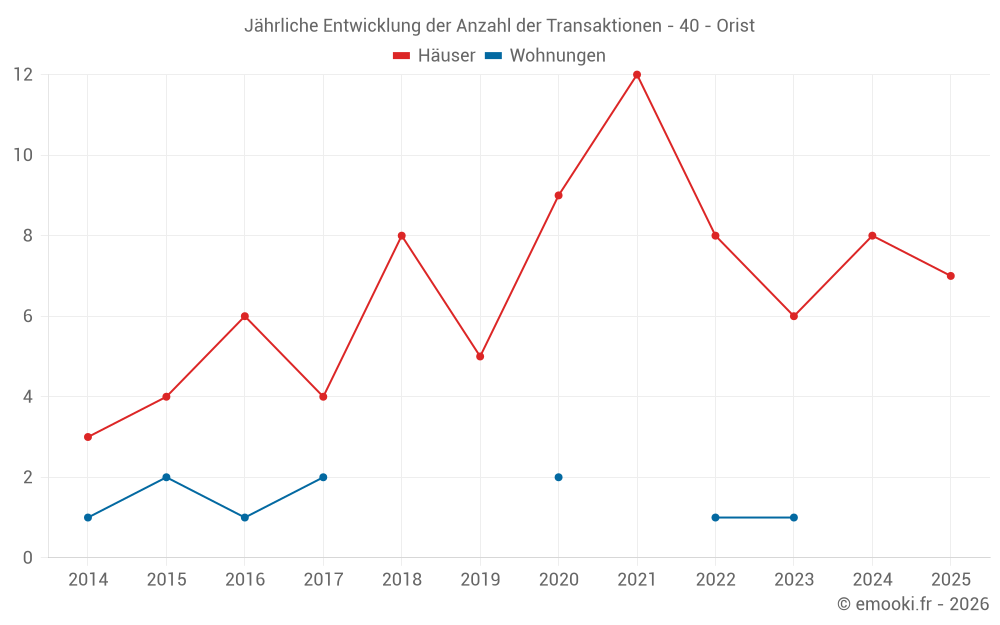 Der Durchschnittspreis auf den 17 Hausgeschäften der letzten 24 Monate in der Gemeinde Orist betrug 2 441 € pro Quadratmeter für einen mittleren Immobilienwert von 253 000 €. Über diesen Zeitraum hinweg lagen 60% der Transaktionen zwischen 1 448 und 3 103 € pro Quadratmeter (vom 2. bis zum 8. Dezil).