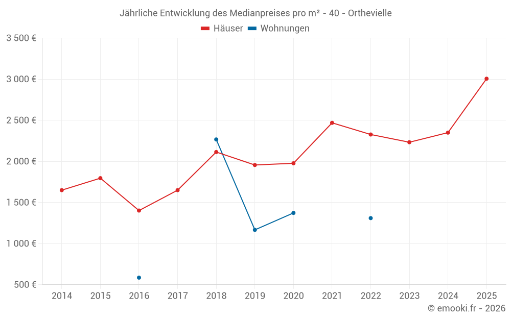 Der Durchschnittspreis auf den 22 Hausgeschäften der letzten 24 Monate in der Gemeinde Orthevielle betrug 2 386 € pro Quadratmeter für einen mittleren Immobilienwert von 231 000 €. Über diesen Zeitraum hinweg lagen 60% der Transaktionen zwischen 1 320 und 3 189 € pro Quadratmeter (vom 2. bis zum 8. Dezil).