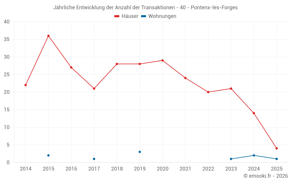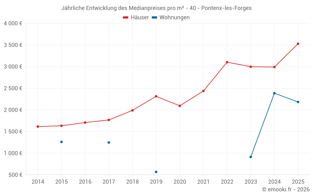 Der Durchschnittspreis auf den 26 Hausgeschäften der letzten 24 Monate in der Gemeinde Pontenx-les-Forges betrug 3 026 € pro Quadratmeter für einen mittleren Immobilienwert von 281 500 €. Über diesen Zeitraum hinweg lagen 60% der Transaktionen zwischen 1 860 und 3 587 € pro Quadratmeter (vom 2. bis zum 8. Dezil).