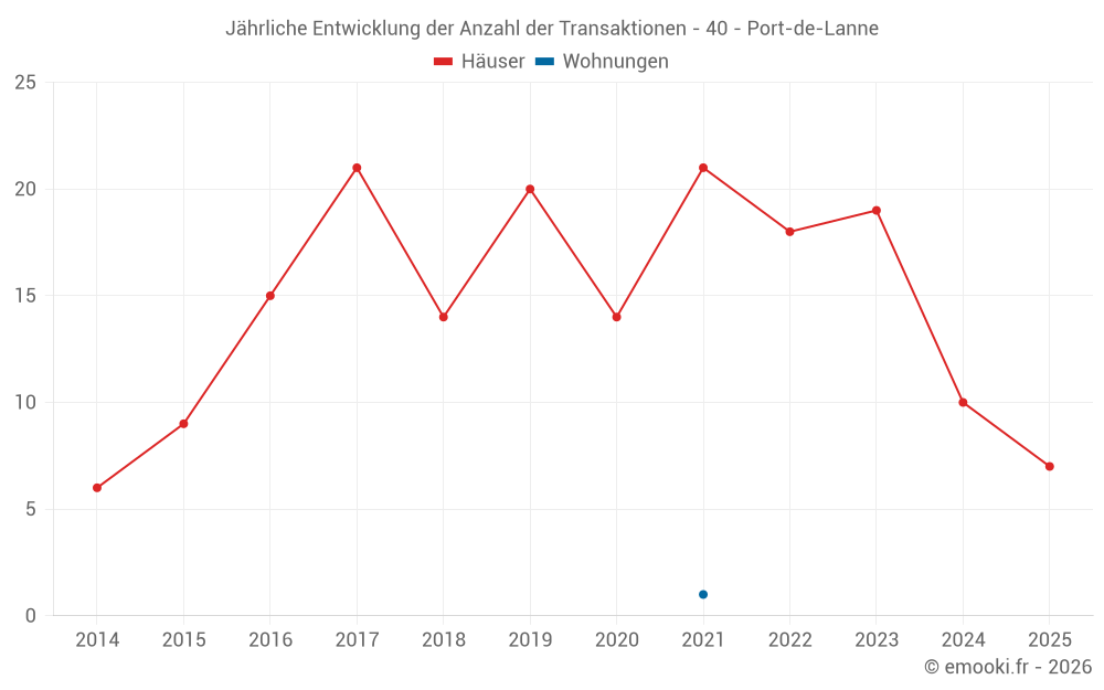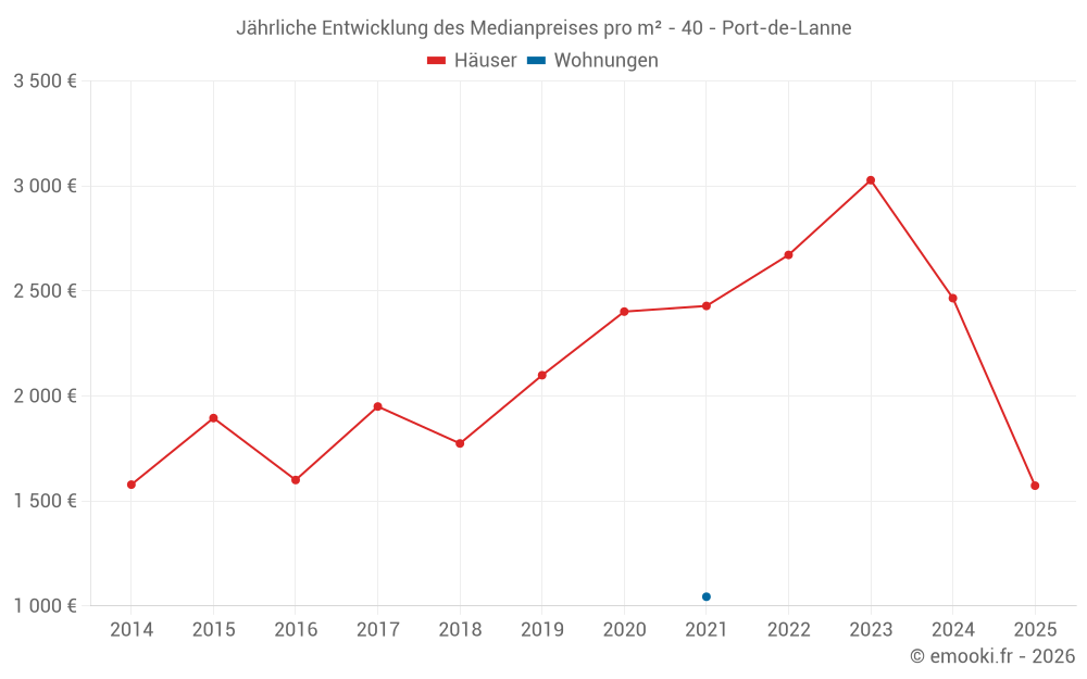 Der Durchschnittspreis auf den 29 Hausgeschäften der letzten 24 Monate in der Gemeinde Port-de-Lanne betrug 2 675 € pro Quadratmeter für einen mittleren Immobilienwert von 262 000 €. Über diesen Zeitraum hinweg lagen 60% der Transaktionen zwischen 1 565 und 3 359 € pro Quadratmeter (vom 2. bis zum 8. Dezil).
