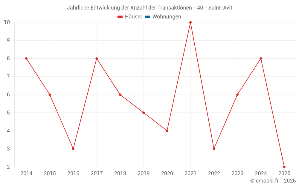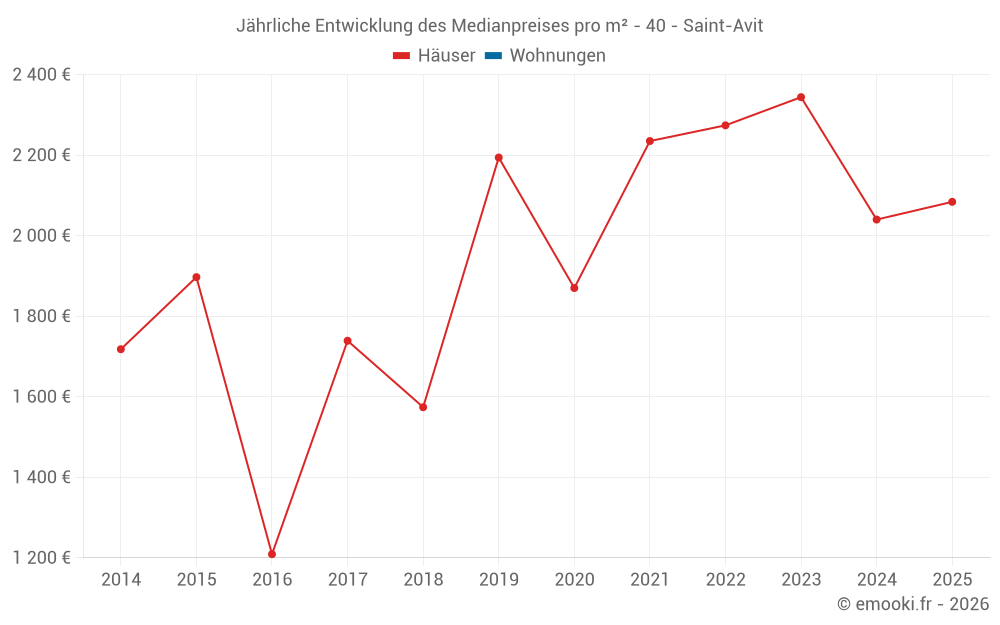 Der Durchschnittspreis auf den 14 Hausgeschäften der letzten 24 Monate in der Gemeinde Saint-Avit betrug 2 210 € pro Quadratmeter für einen mittleren Immobilienwert von 207 000 €. Über diesen Zeitraum hinweg lagen 60% der Transaktionen zwischen 1 653 und 2 431 € pro Quadratmeter (vom 2. bis zum 8. Dezil).