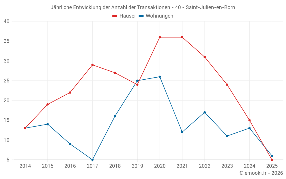Der Durchschnittspreis auf den 24 Wohnungstransaktionen der letzten 24 Monate in der Gemeinde Saint-Julien-en-Born betrug 3 812 € pro Quadratmeter für einen mittleren Immobilienwert von 188 500 €. Über diesen Zeitraum hinweg lagen 60% der Transaktionen zwischen 3 143 und 7 235 € pro Quadratmeter (vom 2. bis zum 8. Dezil).