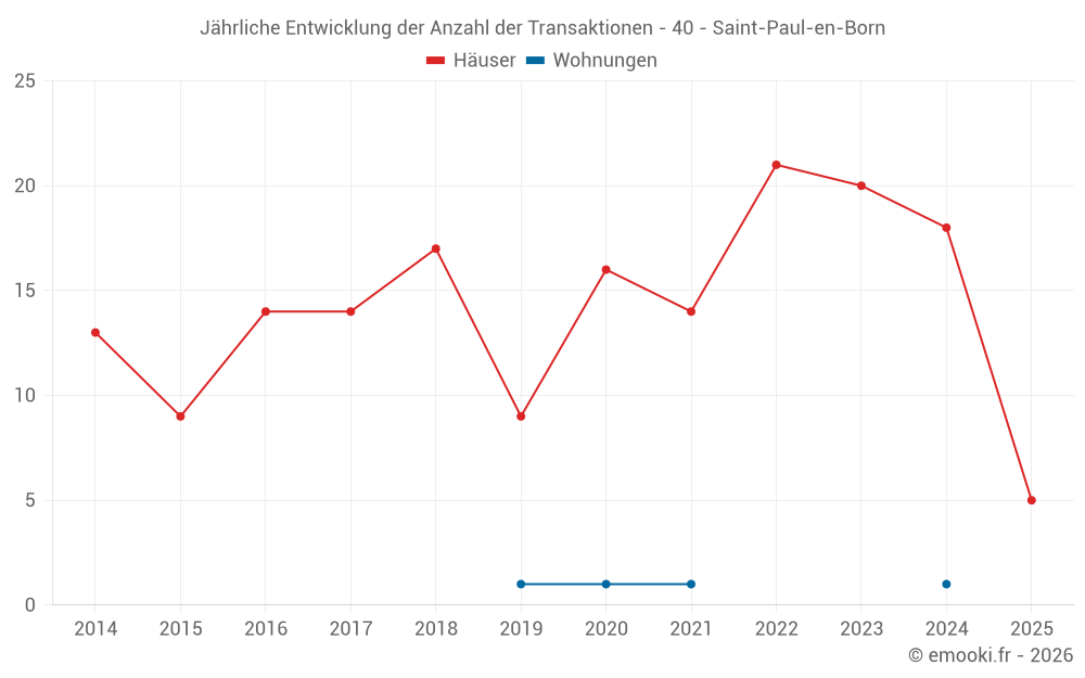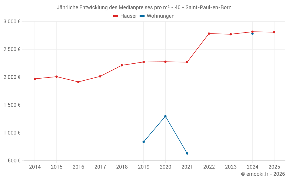 Der Durchschnittspreis auf den 17 Hausgeschäften der letzten 12 Monate in der Gemeinde Saint-Paul-en-Born betrug 2 815 € pro Quadratmeter für einen mittleren Immobilienwert von 250 000 €. Über diesen Zeitraum hinweg lagen 60% der Transaktionen zwischen 2 238 und 3 384 € pro Quadratmeter (vom 2. bis zum 8. Dezil).