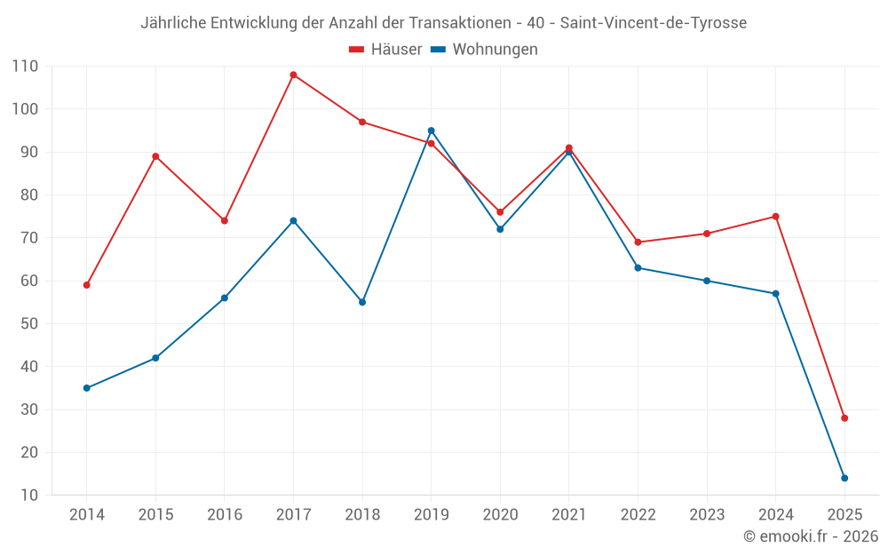 Der Durchschnittspreis auf den 49 Wohnungstransaktionen der letzten 12 Monate in der Gemeinde Saint-Vincent-de-Tyrosse betrug 3 506 € pro Quadratmeter für einen mittleren Immobilienwert von 175 500 €. Über diesen Zeitraum hinweg lagen 60% der Transaktionen zwischen 2 736 und 3 915 € pro Quadratmeter (vom 2. bis zum 8. Dezil).