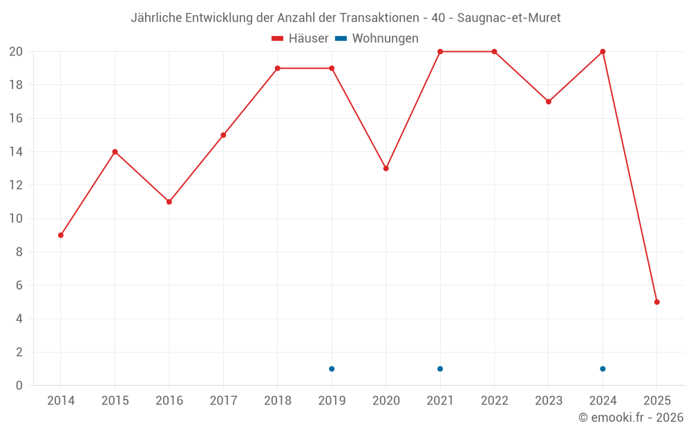 Der Durchschnittspreis auf den 16 Hausgeschäften der letzten 12 Monate in der Gemeinde Saugnac-et-Muret betrug 2 251 € pro Quadratmeter für einen mittleren Immobilienwert von 213 850 €. Über diesen Zeitraum hinweg lagen 60% der Transaktionen zwischen 1 802 und 2 734 € pro Quadratmeter (vom 2. bis zum 8. Dezil).