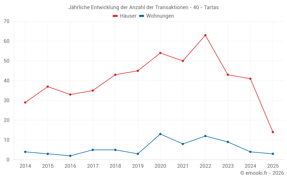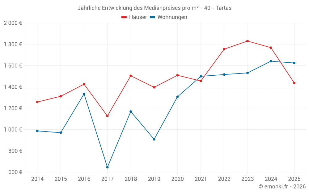 Der Durchschnittspreis auf den 42 Hausgeschäften der letzten 12 Monate in der Gemeinde Tartas betrug 1 690 € pro Quadratmeter für einen mittleren Immobilienwert von 170 000 €. Über diesen Zeitraum hinweg lagen 60% der Transaktionen zwischen 923 und 2 224 € pro Quadratmeter (vom 2. bis zum 8. Dezil).
