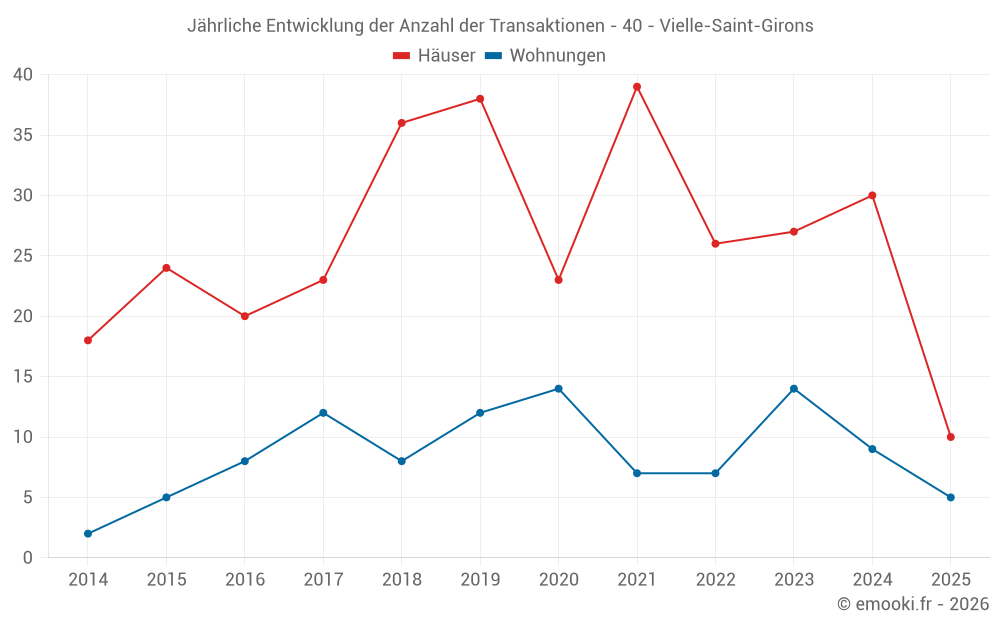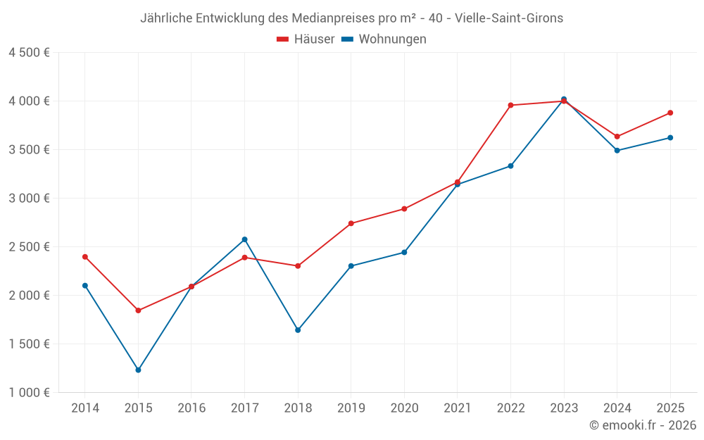 Der Durchschnittspreis auf den 29 Hausgeschäften der letzten 12 Monate in der Gemeinde Vielle-Saint-Girons betrug 3 800 € pro Quadratmeter für einen mittleren Immobilienwert von 276 000 €. Über diesen Zeitraum hinweg lagen 60% der Transaktionen zwischen 2 625 und 4 286 € pro Quadratmeter (vom 2. bis zum 8. Dezil).