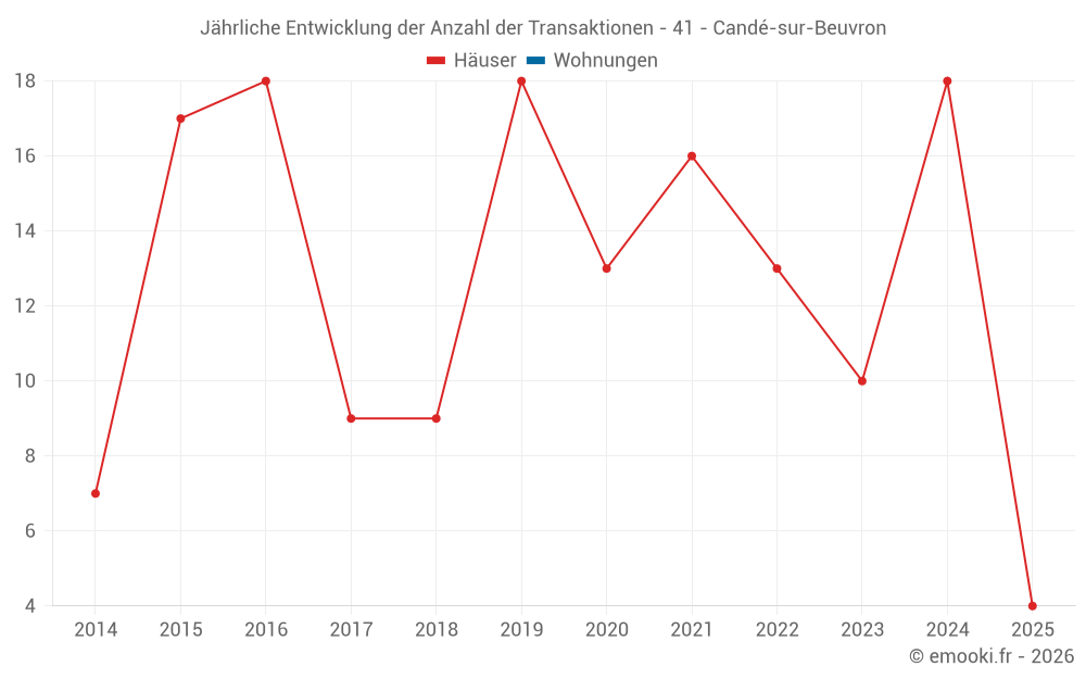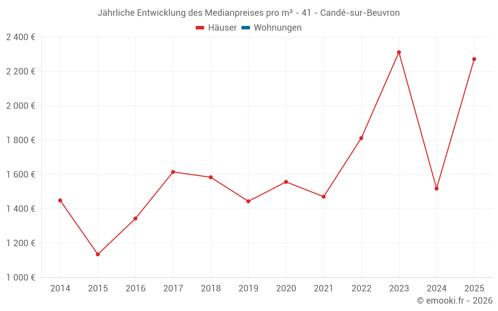 Der Durchschnittspreis auf den 27 Hausgeschäften der letzten 24 Monate in der Gemeinde Candé-sur-Beuvron betrug 1 782 € pro Quadratmeter für einen mittleren Immobilienwert von 160 000 €. Über diesen Zeitraum hinweg lagen 60% der Transaktionen zwischen 1 304 und 2 325 € pro Quadratmeter (vom 2. bis zum 8. Dezil).