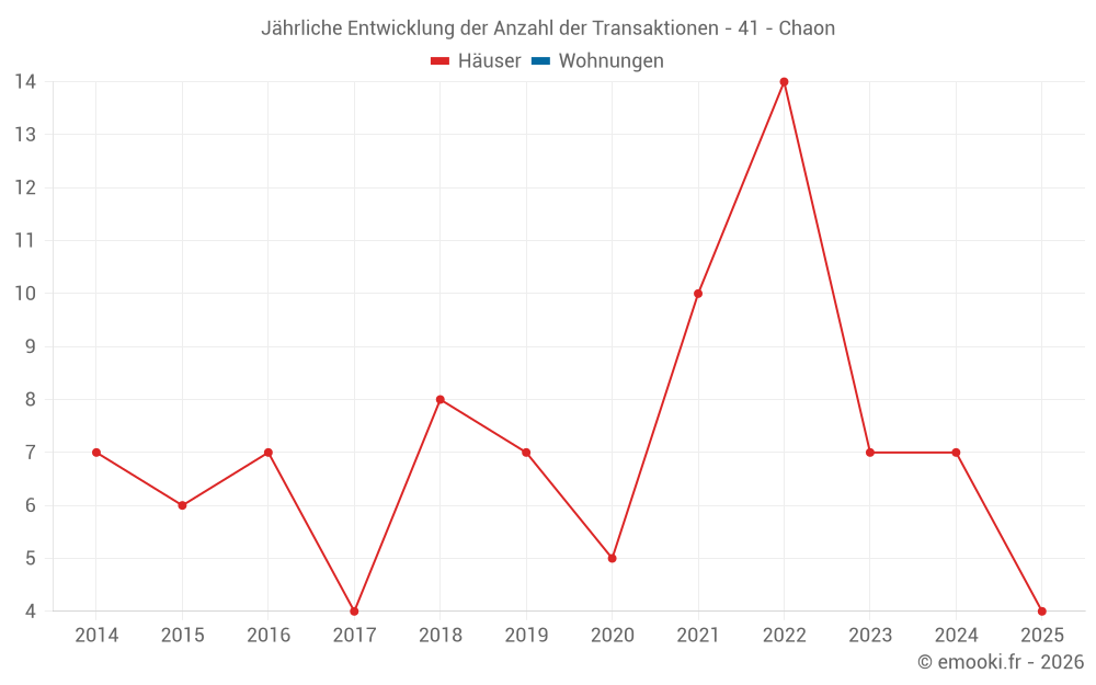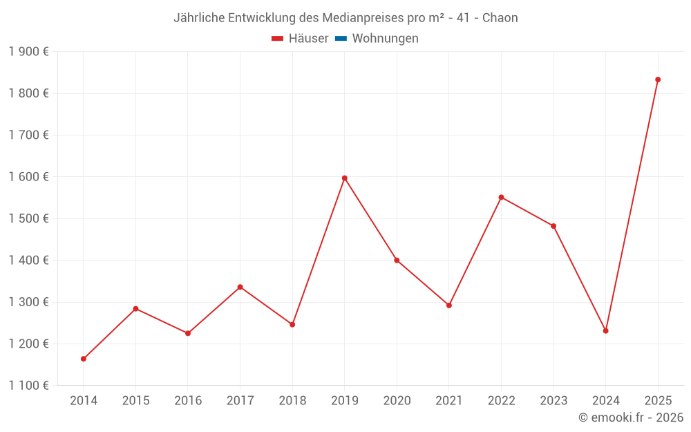 Der Durchschnittspreis auf den 15 Hausgeschäften der letzten 24 Monate in der Gemeinde Chaon betrug 1 482 € pro Quadratmeter für einen mittleren Immobilienwert von 182 000 €. Über diesen Zeitraum hinweg lagen 60% der Transaktionen zwischen 1 082 und 2 269 € pro Quadratmeter (vom 2. bis zum 8. Dezil).