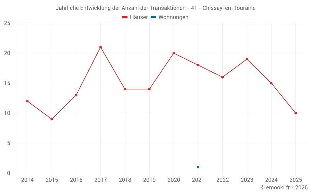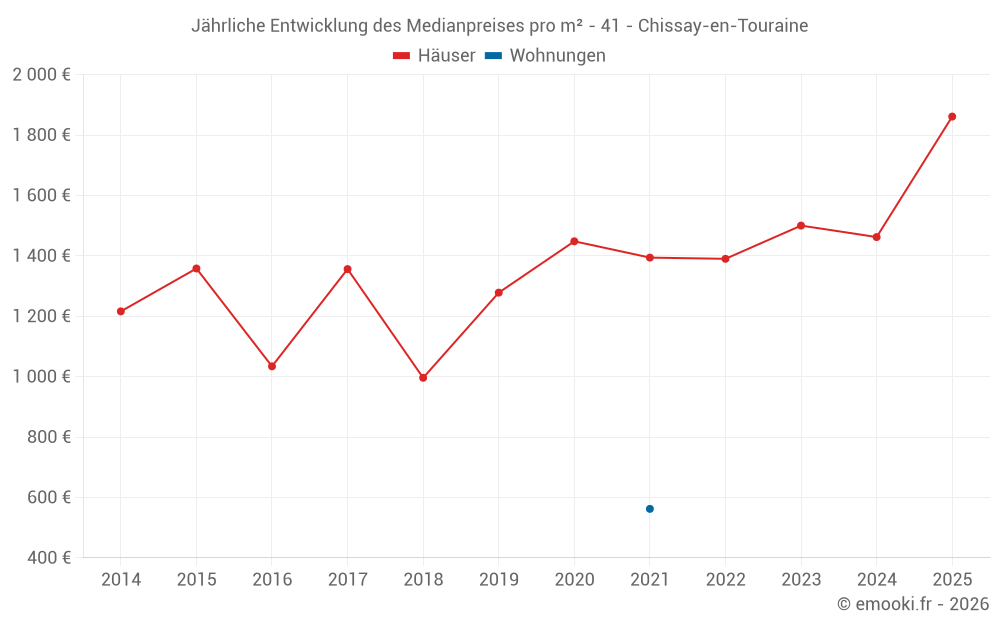 Der Durchschnittspreis auf den 17 Hausgeschäften der letzten 12 Monate in der Gemeinde Chissay-en-Touraine betrug 1 765 € pro Quadratmeter für einen mittleren Immobilienwert von 162 000 €. Über diesen Zeitraum hinweg lagen 60% der Transaktionen zwischen 1 206 und 1 985 € pro Quadratmeter (vom 2. bis zum 8. Dezil).