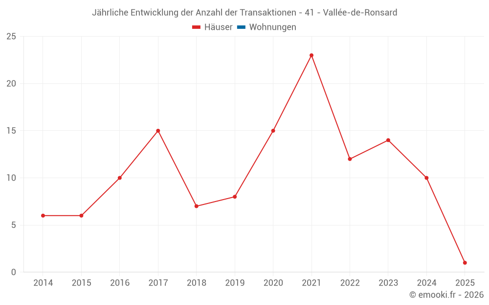 Der Durchschnittspreis auf den 21 Hausgeschäften der letzten 24 Monate in der Gemeinde Vallée-de-Ronsard betrug 1 055 € pro Quadratmeter für einen mittleren Immobilienwert von 80 000 €. Über diesen Zeitraum hinweg lagen 60% der Transaktionen zwischen 550 und 1 419 € pro Quadratmeter (vom 2. bis zum 8. Dezil).
