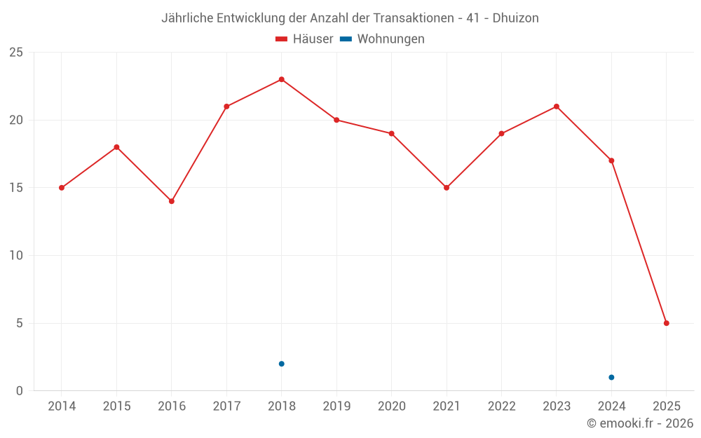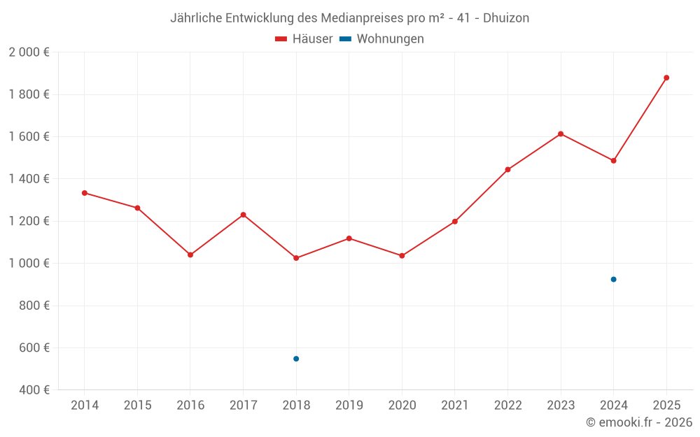 Der Durchschnittspreis auf den 33 Hausgeschäften der letzten 24 Monate in der Gemeinde Dhuizon betrug 1 731 € pro Quadratmeter für einen mittleren Immobilienwert von 135 000 €. Über diesen Zeitraum hinweg lagen 60% der Transaktionen zwischen 1 113 und 2 117 € pro Quadratmeter (vom 2. bis zum 8. Dezil).