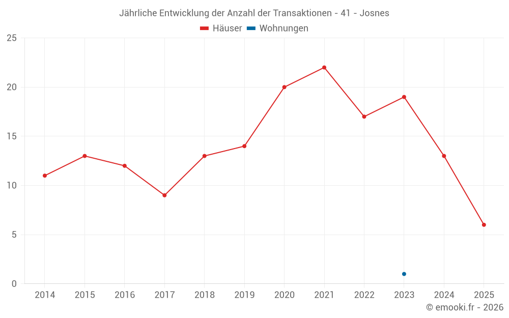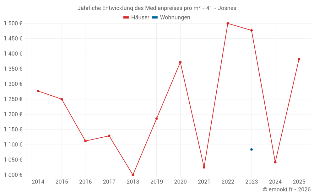 Der Durchschnittspreis auf den 29 Hausgeschäften der letzten 24 Monate in der Gemeinde Josnes betrug 1 284 € pro Quadratmeter für einen mittleren Immobilienwert von 155 000 €. Über diesen Zeitraum hinweg lagen 60% der Transaktionen zwischen 937 und 1 877 € pro Quadratmeter (vom 2. bis zum 8. Dezil).