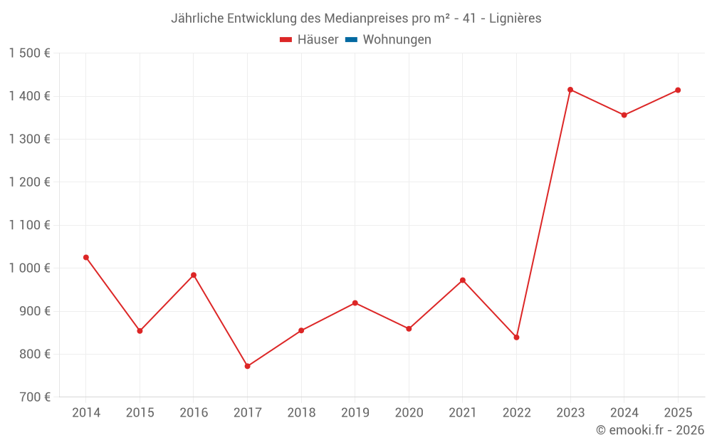 Der Durchschnittspreis auf den 14 Hausgeschäften der letzten 24 Monate in der Gemeinde Lignières betrug 1 394 € pro Quadratmeter für einen mittleren Immobilienwert von 157 000 €. Über diesen Zeitraum hinweg lagen 60% der Transaktionen zwischen 1 110 und 1 760 € pro Quadratmeter (vom 2. bis zum 8. Dezil).
