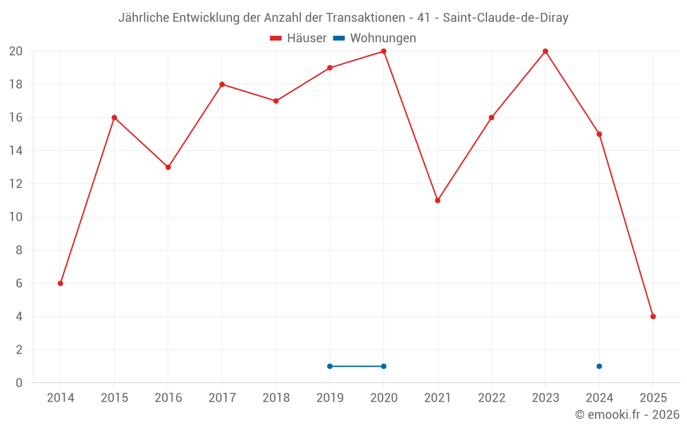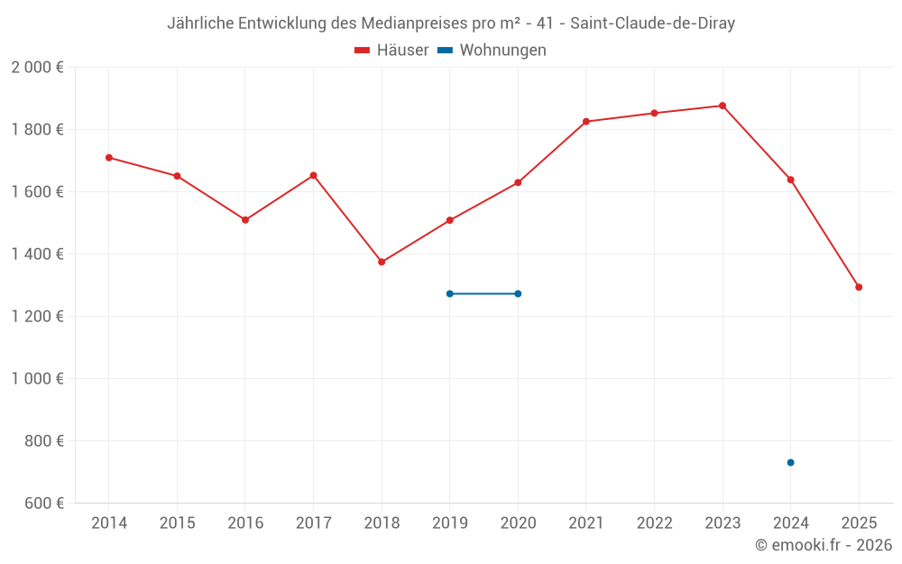 Der Durchschnittspreis auf den 28 Hausgeschäften der letzten 24 Monate in der Gemeinde Saint-Claude-de-Diray betrug 1 680 € pro Quadratmeter für einen mittleren Immobilienwert von 188 000 €. Über diesen Zeitraum hinweg lagen 60% der Transaktionen zwischen 1 082 und 2 193 € pro Quadratmeter (vom 2. bis zum 8. Dezil).
