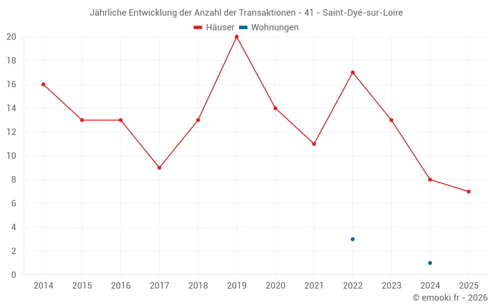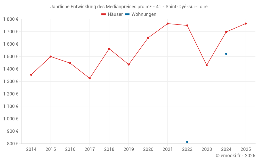 Der Durchschnittspreis auf den 22 Hausgeschäften der letzten 24 Monate in der Gemeinde Saint-Dyé-sur-Loire betrug 1 789 € pro Quadratmeter für einen mittleren Immobilienwert von 149 350 €. Über diesen Zeitraum hinweg lagen 60% der Transaktionen zwischen 833 und 2 256 € pro Quadratmeter (vom 2. bis zum 8. Dezil).