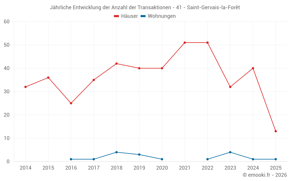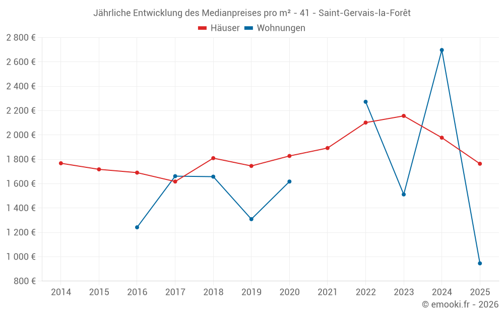 Der Durchschnittspreis auf den 33 Hausgeschäften der letzten 12 Monate in der Gemeinde Saint-Gervais-la-Forêt betrug 1 867 € pro Quadratmeter für einen mittleren Immobilienwert von 190 000 €. Über diesen Zeitraum hinweg lagen 60% der Transaktionen zwischen 1 533 und 2 535 € pro Quadratmeter (vom 2. bis zum 8. Dezil).