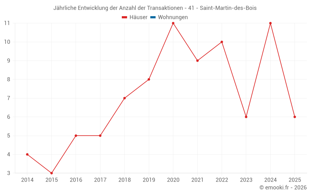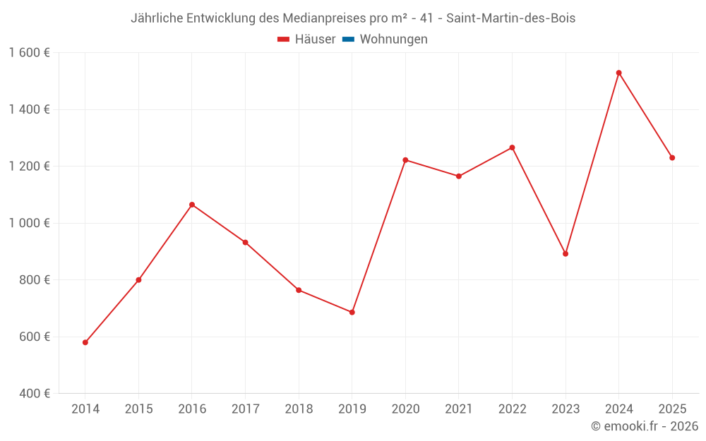 Der Durchschnittspreis auf den 22 Hausgeschäften der letzten 24 Monate in der Gemeinde Saint-Martin-des-Bois betrug 1 332 € pro Quadratmeter für einen mittleren Immobilienwert von 114 000 €. Über diesen Zeitraum hinweg lagen 60% der Transaktionen zwischen 861 und 1 599 € pro Quadratmeter (vom 2. bis zum 8. Dezil).
