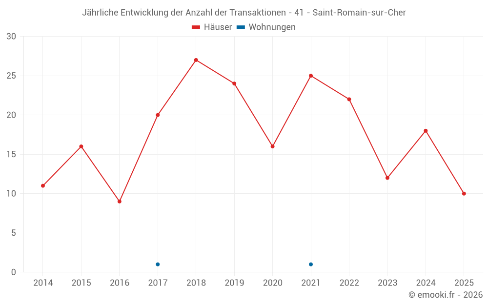Der Durchschnittspreis auf den 34 Hausgeschäften der letzten 24 Monate in der Gemeinde Saint-Romain-sur-Cher betrug 1 154 € pro Quadratmeter für einen mittleren Immobilienwert von 122 574 €. Über diesen Zeitraum hinweg lagen 60% der Transaktionen zwischen 905 und 1 605 € pro Quadratmeter (vom 2. bis zum 8. Dezil).
