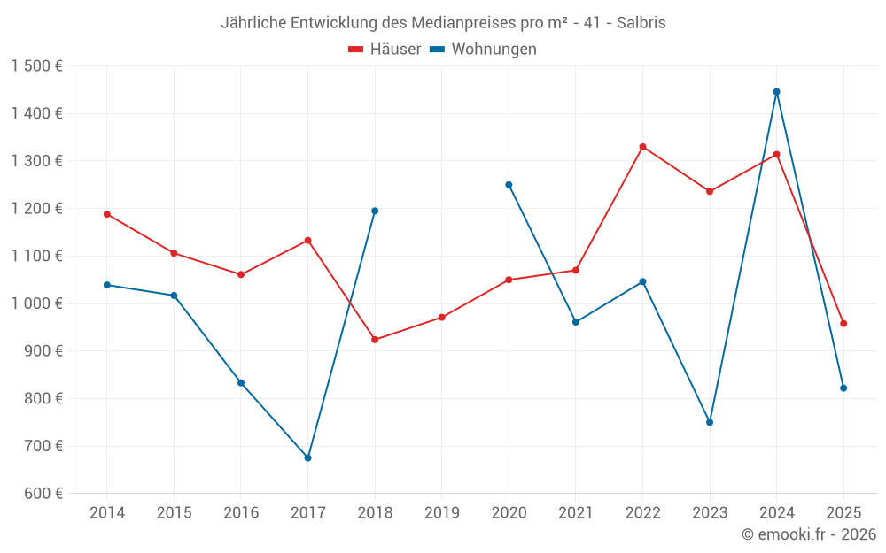 Der Durchschnittspreis auf den 33 Hausgeschäften der letzten 6 Monate in der Gemeinde Salbris betrug 958 € pro Quadratmeter für einen mittleren Immobilienwert von 75 000 €. Über diesen Zeitraum hinweg lagen 60% der Transaktionen zwischen 717 und 1 393 € pro Quadratmeter (vom 2. bis zum 8. Dezil).