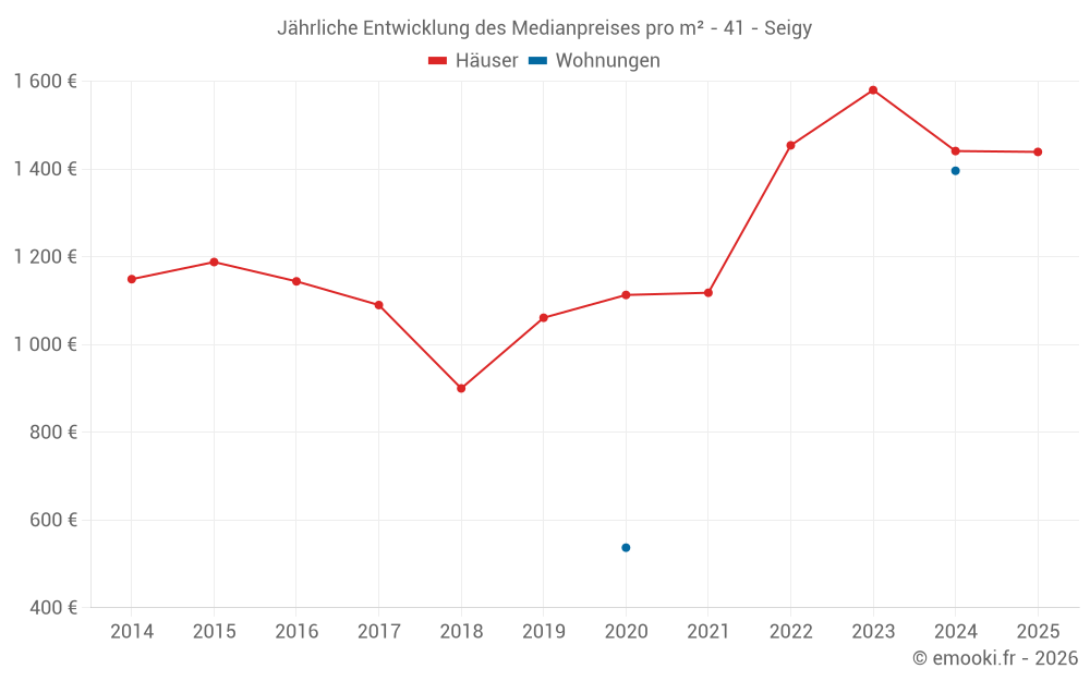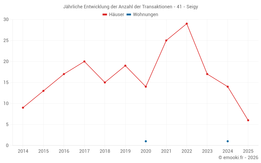 Der Durchschnittspreis auf den 27 Hausgeschäften der letzten 24 Monate in der Gemeinde Seigy betrug 1 515 € pro Quadratmeter für einen mittleren Immobilienwert von 130 000 €. Über diesen Zeitraum hinweg lagen 60% der Transaktionen zwischen 1 072 und 2 021 € pro Quadratmeter (vom 2. bis zum 8. Dezil).