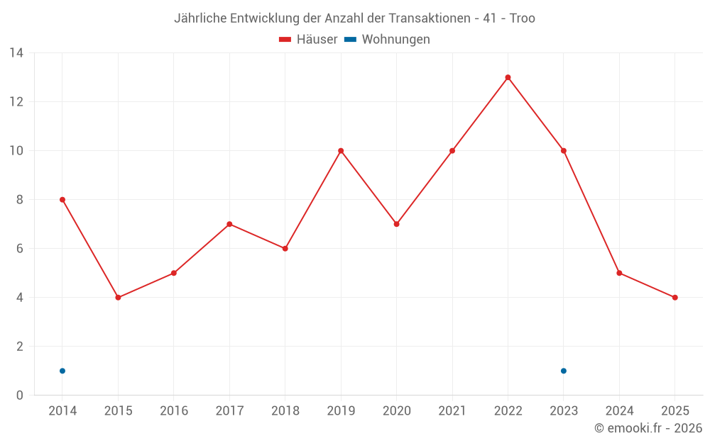 Der Durchschnittspreis auf den 16 Hausgeschäften der letzten 24 Monate in der Gemeinde Troo betrug 1 712 € pro Quadratmeter für einen mittleren Immobilienwert von 157 500 €. Über diesen Zeitraum hinweg lagen 60% der Transaktionen zwischen 1 024 und 2 396 € pro Quadratmeter (vom 2. bis zum 8. Dezil).