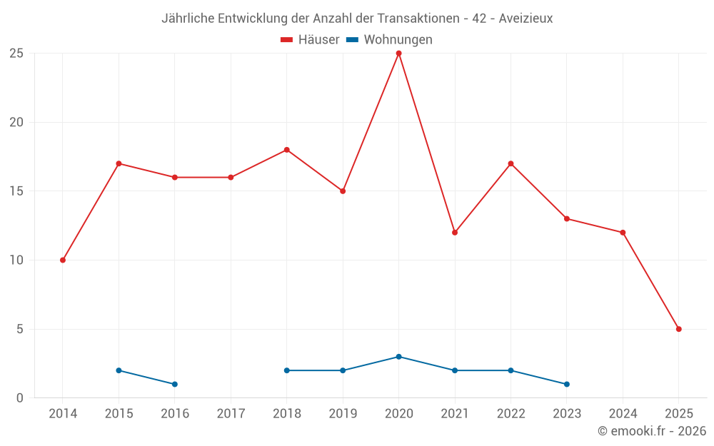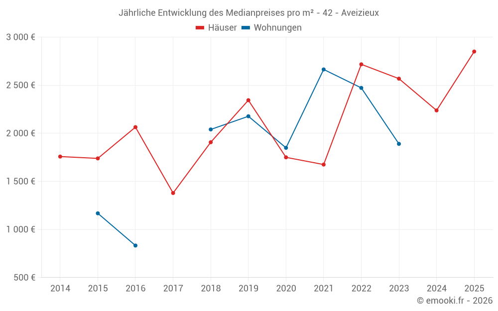 Der Durchschnittspreis auf den 25 Hausgeschäften der letzten 24 Monate in der Gemeinde Aveizieux betrug 2 644 € pro Quadratmeter für einen mittleren Immobilienwert von 260 000 €. Über diesen Zeitraum hinweg lagen 60% der Transaktionen zwischen 2 036 und 3 086 € pro Quadratmeter (vom 2. bis zum 8. Dezil).