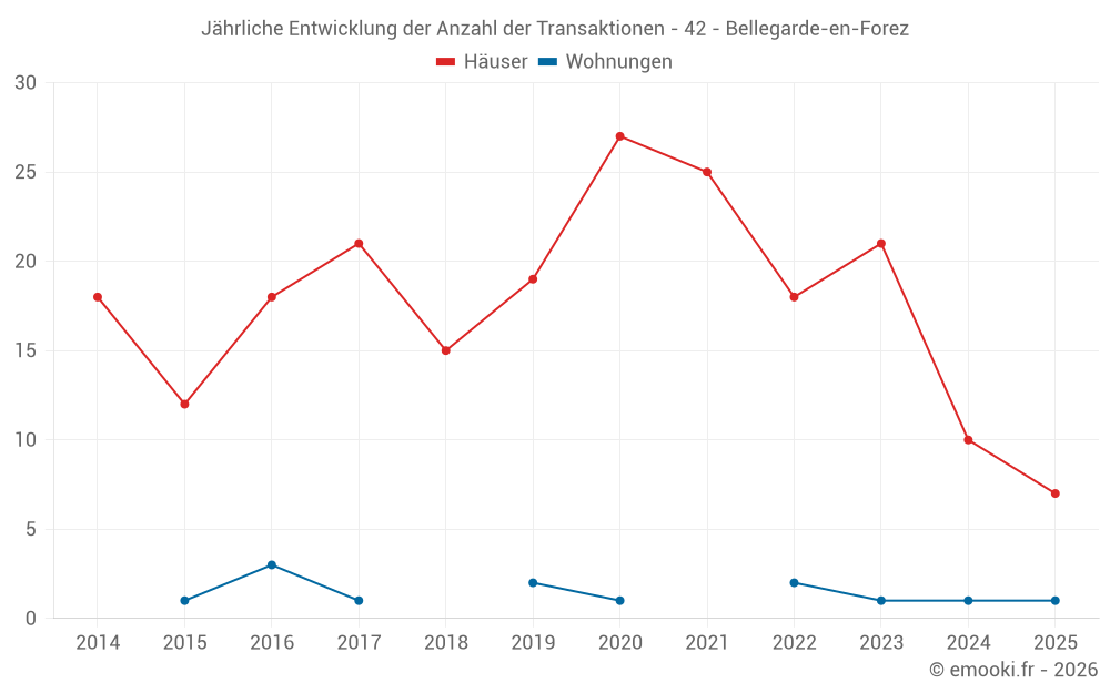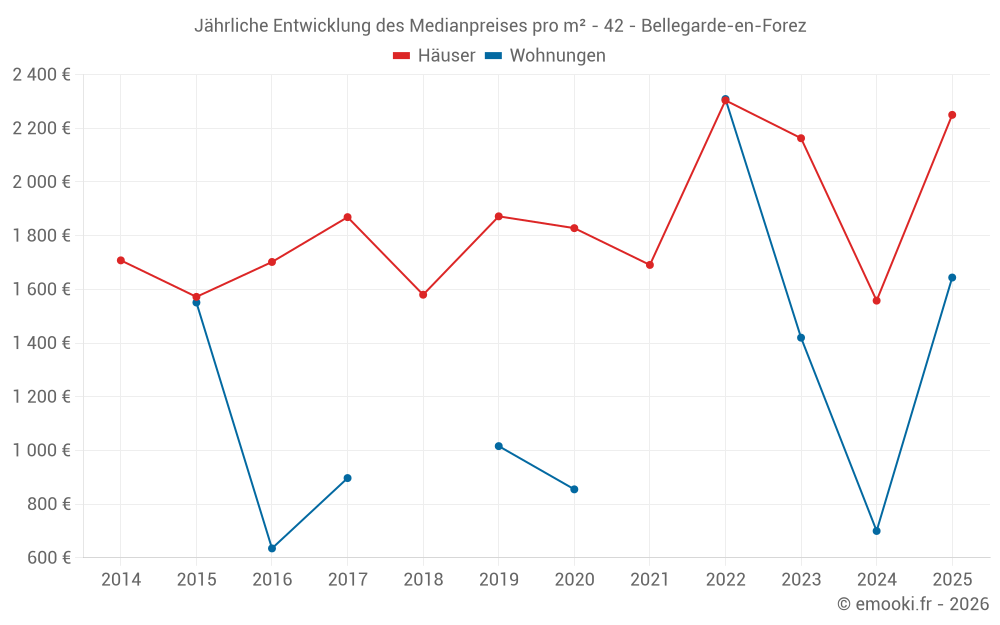 Der Durchschnittspreis auf den 29 Hausgeschäften der letzten 24 Monate in der Gemeinde Bellegarde-en-Forez betrug 2 035 € pro Quadratmeter für einen mittleren Immobilienwert von 244 124 €. Über diesen Zeitraum hinweg lagen 60% der Transaktionen zwischen 1 200 und 2 716 € pro Quadratmeter (vom 2. bis zum 8. Dezil).