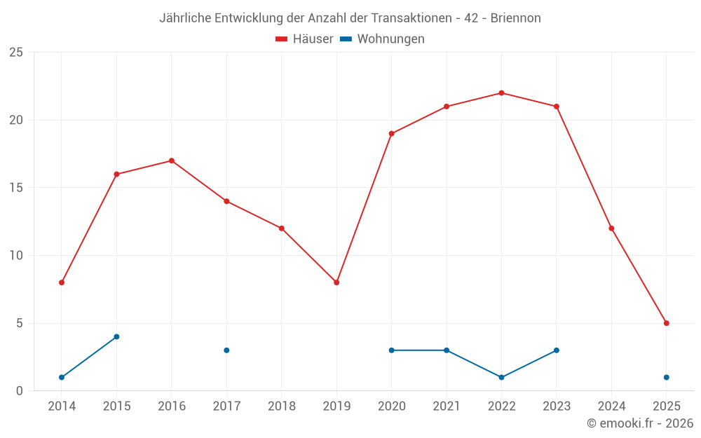 Der Durchschnittspreis auf den 30 Hausgeschäften der letzten 24 Monate in der Gemeinde Briennon betrug 1 452 € pro Quadratmeter für einen mittleren Immobilienwert von 129 350 €. Über diesen Zeitraum hinweg lagen 60% der Transaktionen zwischen 940 und 2 128 € pro Quadratmeter (vom 2. bis zum 8. Dezil).