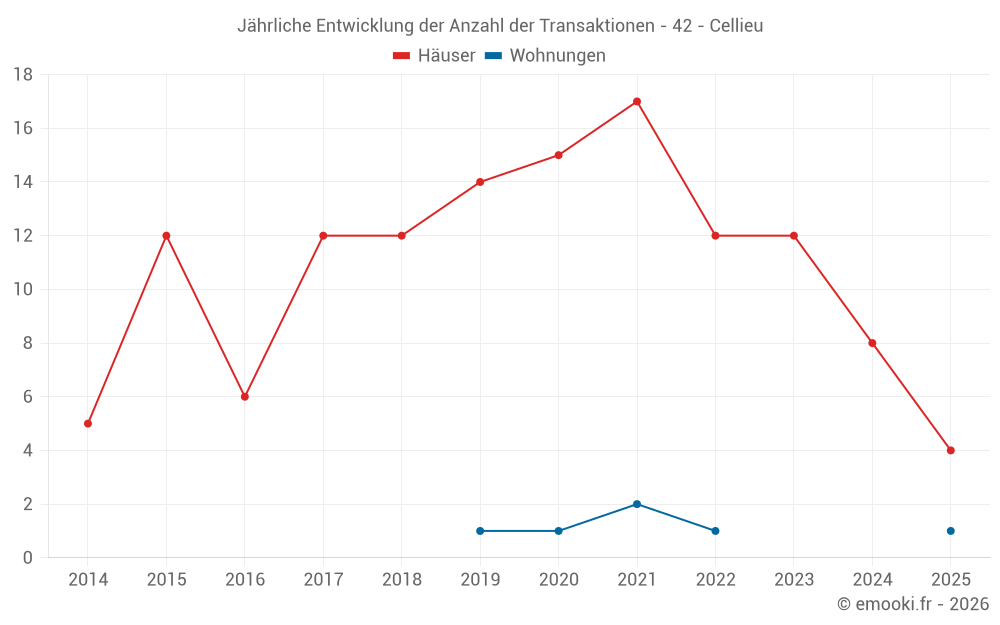 Der Durchschnittspreis auf den 17 Hausgeschäften der letzten 24 Monate in der Gemeinde Cellieu betrug 2 511 € pro Quadratmeter für einen mittleren Immobilienwert von 245 000 €. Über diesen Zeitraum hinweg lagen 60% der Transaktionen zwischen 1 057 und 3 337 € pro Quadratmeter (vom 2. bis zum 8. Dezil).
