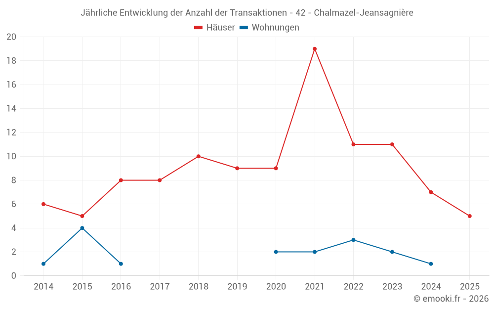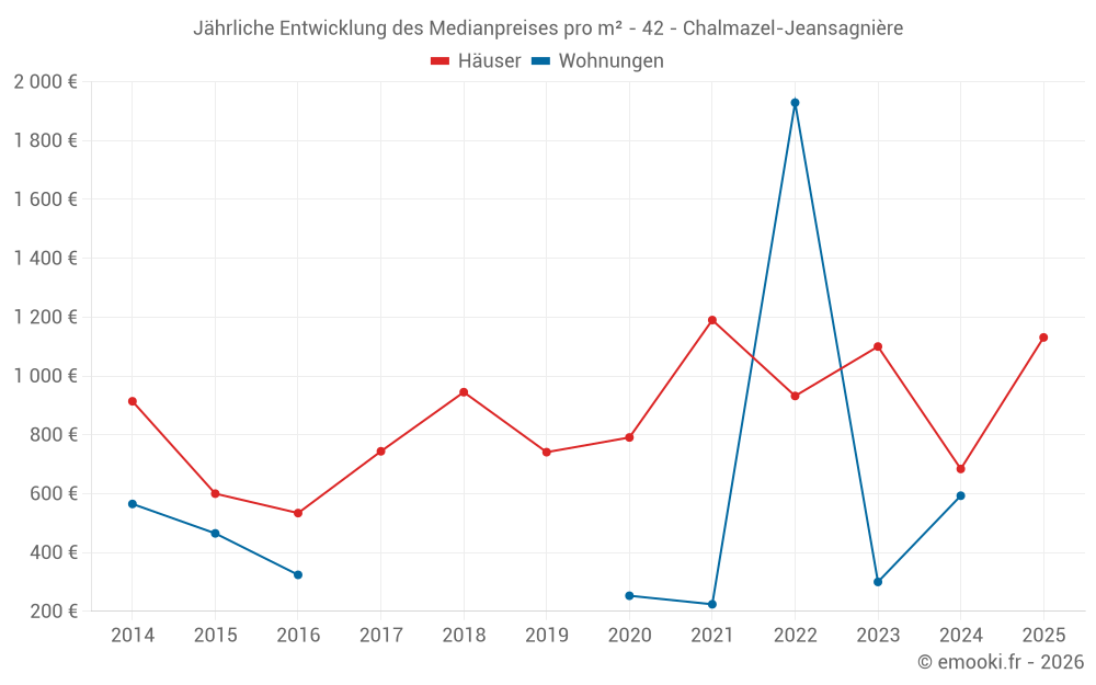 Der Durchschnittspreis auf den 16 Hausgeschäften der letzten 24 Monate in der Gemeinde Chalmazel-Jeansagnière betrug 1 038 € pro Quadratmeter für einen mittleren Immobilienwert von 79 200 €. Über diesen Zeitraum hinweg lagen 60% der Transaktionen zwischen 493 und 1 421 € pro Quadratmeter (vom 2. bis zum 8. Dezil).