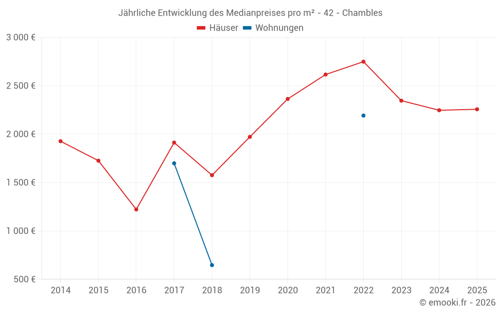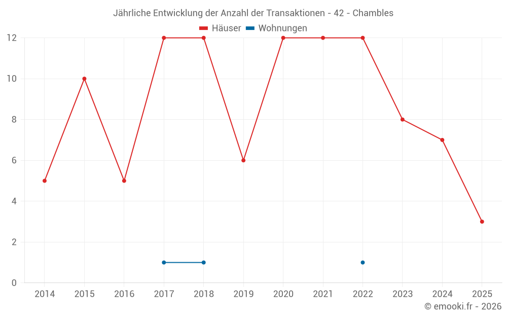 Der Durchschnittspreis auf den 14 Hausgeschäften der letzten 24 Monate in der Gemeinde Chambles betrug 2 370 € pro Quadratmeter für einen mittleren Immobilienwert von 211 700 €. Über diesen Zeitraum hinweg lagen 60% der Transaktionen zwischen 2 057 und 2 736 € pro Quadratmeter (vom 2. bis zum 8. Dezil).