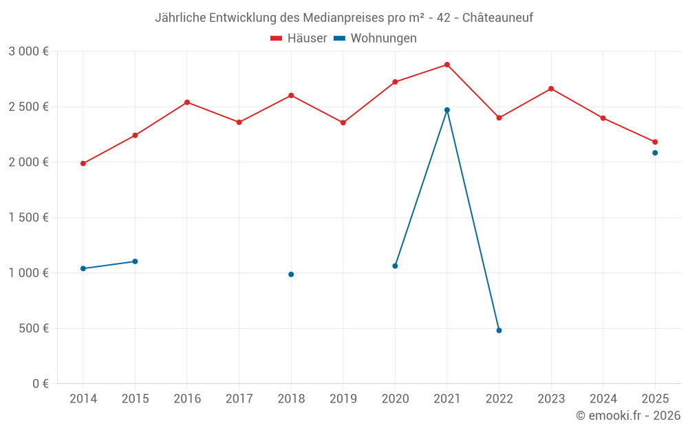 Der Durchschnittspreis auf den 21 Hausgeschäften der letzten 24 Monate in der Gemeinde Châteauneuf betrug 2 846 € pro Quadratmeter für einen mittleren Immobilienwert von 236 850 €. Über diesen Zeitraum hinweg lagen 60% der Transaktionen zwischen 1 516 und 3 359 € pro Quadratmeter (vom 2. bis zum 8. Dezil).