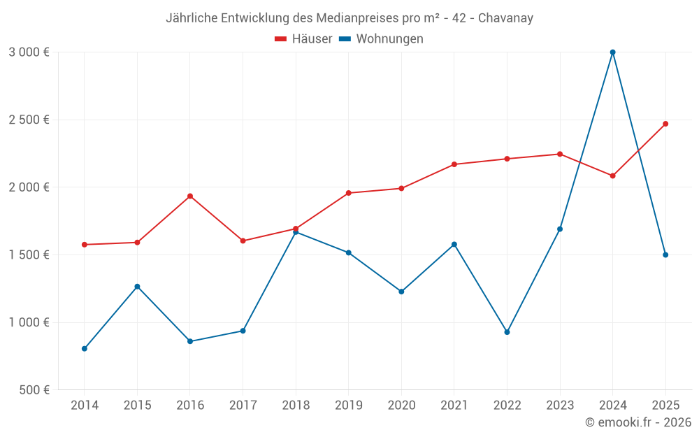 Der Durchschnittspreis auf den 21 Hausgeschäften der letzten 12 Monate in der Gemeinde Chavanay betrug 2 387 € pro Quadratmeter für einen mittleren Immobilienwert von 205 000 €. Über diesen Zeitraum hinweg lagen 60% der Transaktionen zwischen 1 847 und 2 881 € pro Quadratmeter (vom 2. bis zum 8. Dezil).