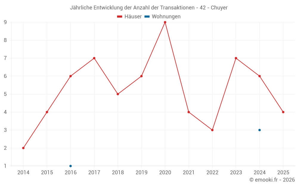 Der Durchschnittspreis auf den 15 Hausgeschäften der letzten 24 Monate in der Gemeinde Chuyer betrug 2 188 € pro Quadratmeter für einen mittleren Immobilienwert von 150 000 €. Über diesen Zeitraum hinweg lagen 60% der Transaktionen zwischen 1 162 und 3 470 € pro Quadratmeter (vom 2. bis zum 8. Dezil).