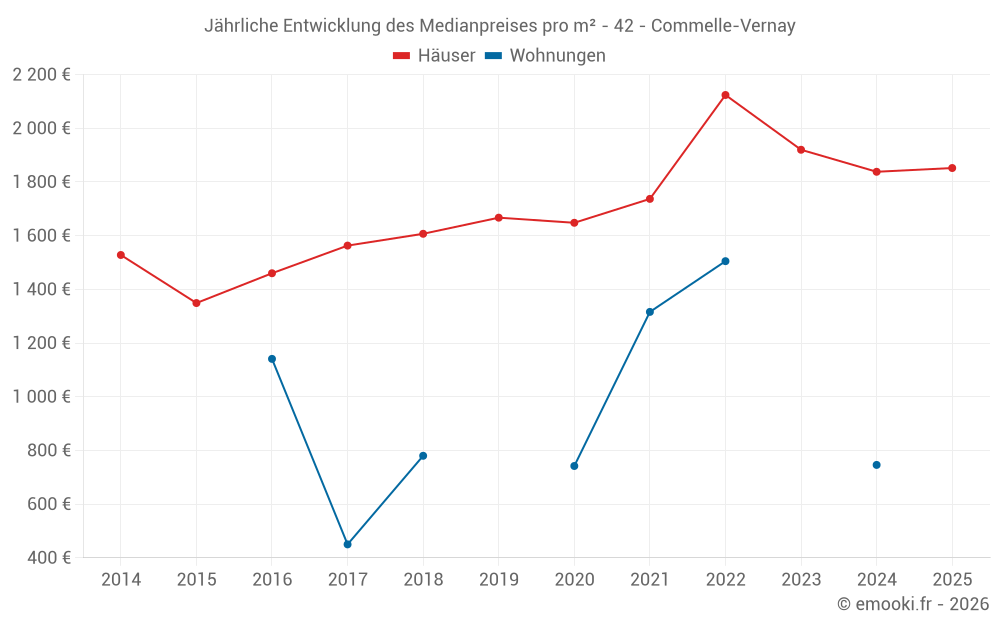 Der Durchschnittspreis auf den 30 Hausgeschäften der letzten 12 Monate in der Gemeinde Commelle-Vernay betrug 1 838 € pro Quadratmeter für einen mittleren Immobilienwert von 190 500 €. Über diesen Zeitraum hinweg lagen 60% der Transaktionen zwischen 1 535 und 2 271 € pro Quadratmeter (vom 2. bis zum 8. Dezil).