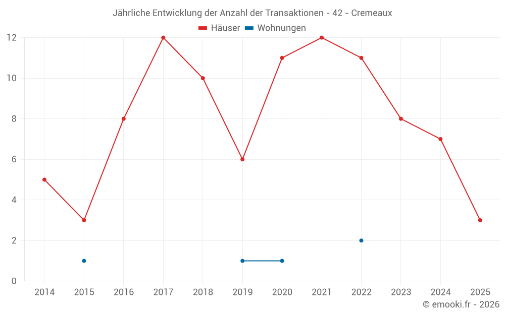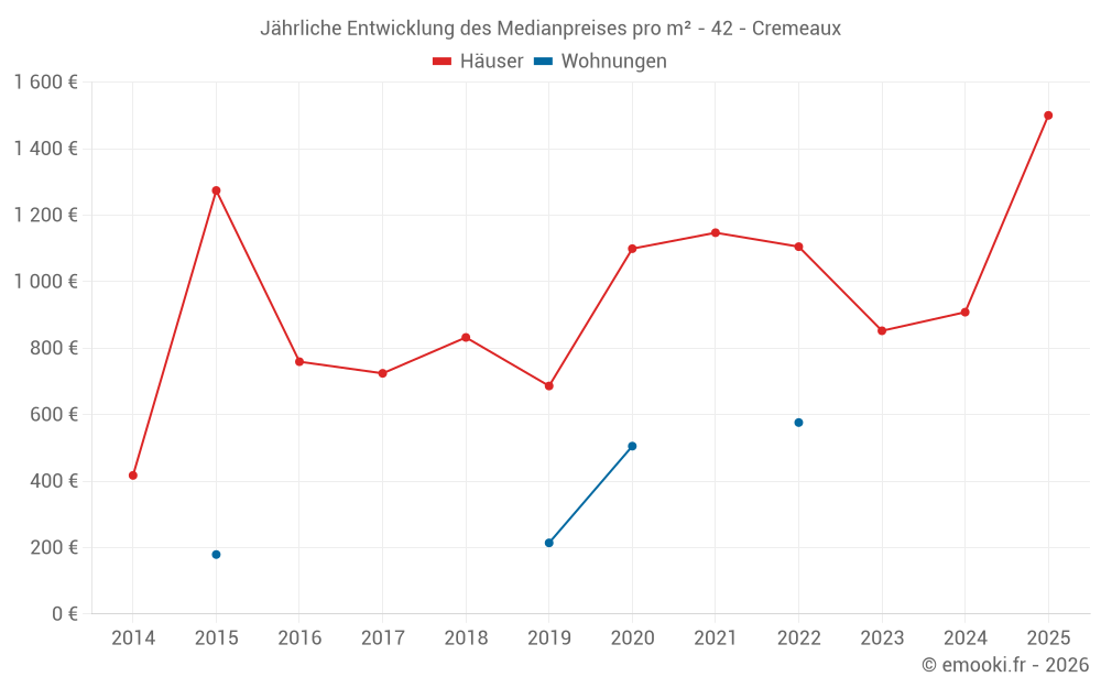 Der Durchschnittspreis auf den 14 Hausgeschäften der letzten 24 Monate in der Gemeinde Cremeaux betrug 919 € pro Quadratmeter für einen mittleren Immobilienwert von 93 000 €. Über diesen Zeitraum hinweg lagen 60% der Transaktionen zwischen 747 und 1 718 € pro Quadratmeter (vom 2. bis zum 8. Dezil).