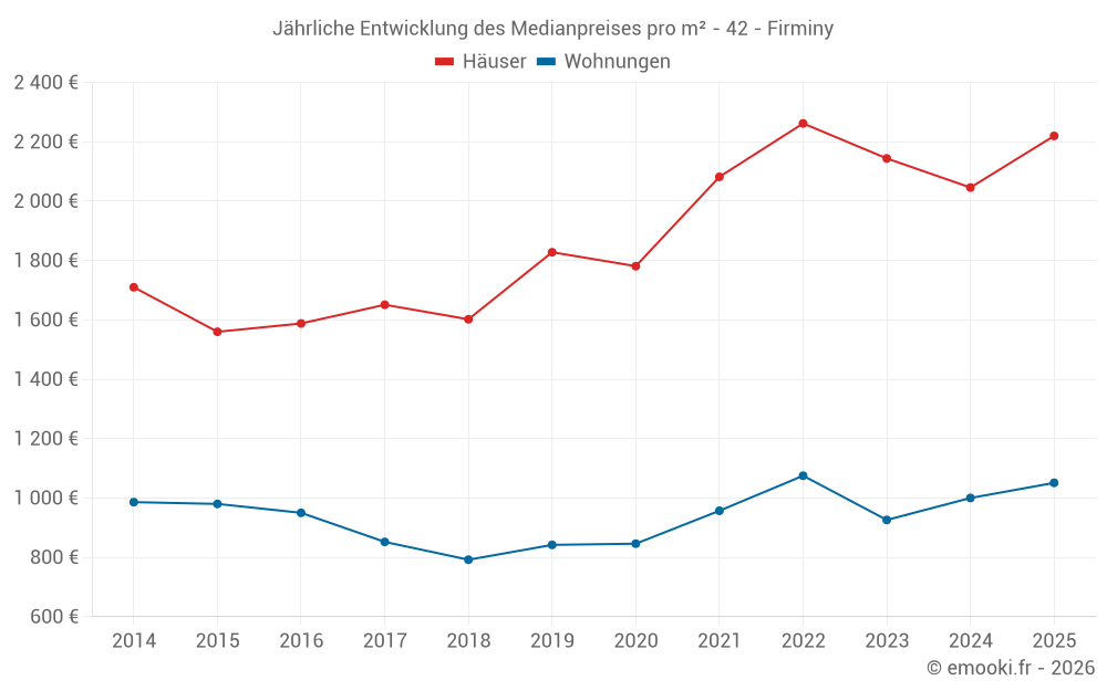 Der Durchschnittspreis auf den 22 Hausgeschäften der letzten 6 Monate in der Gemeinde Firminy betrug 2 220 € pro Quadratmeter für einen mittleren Immobilienwert von 235 675 €. Über diesen Zeitraum hinweg lagen 60% der Transaktionen zwischen 2 000 und 2 916 € pro Quadratmeter (vom 2. bis zum 8. Dezil).