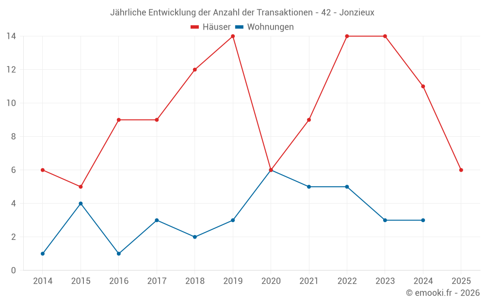 Der Durchschnittspreis auf den 25 Hausgeschäften der letzten 24 Monate in der Gemeinde Jonzieux betrug 1 863 € pro Quadratmeter für einen mittleren Immobilienwert von 195 000 €. Über diesen Zeitraum hinweg lagen 60% der Transaktionen zwischen 1 208 und 2 559 € pro Quadratmeter (vom 2. bis zum 8. Dezil).