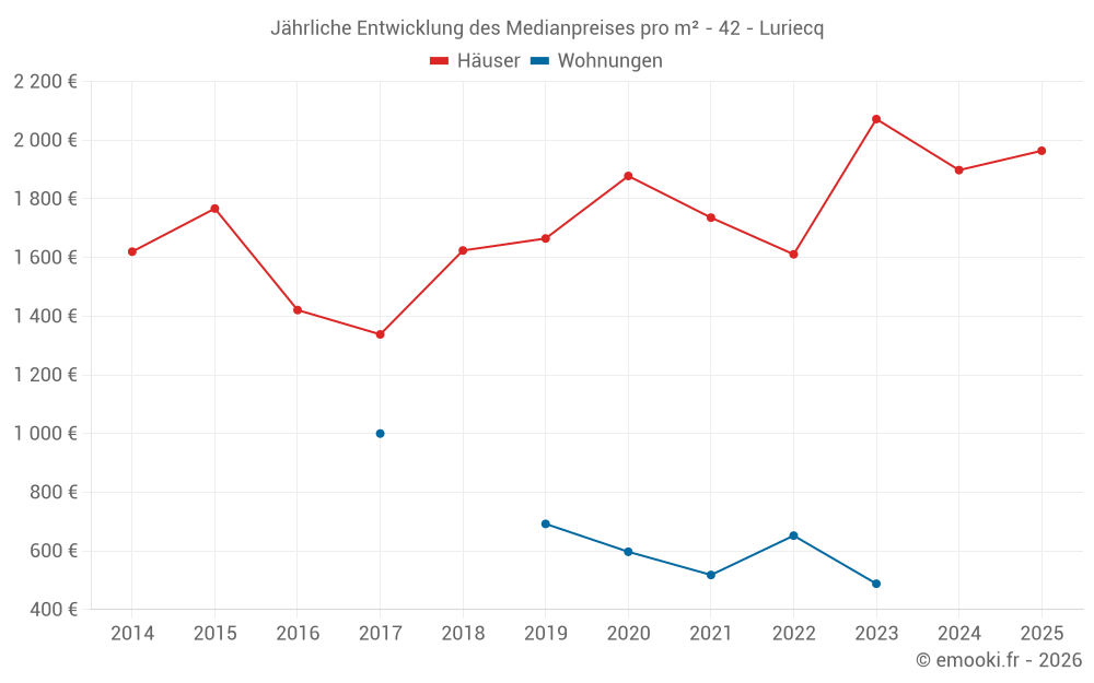 Der Durchschnittspreis auf den 22 Hausgeschäften der letzten 24 Monate in der Gemeinde Luriecq betrug 1 974 € pro Quadratmeter für einen mittleren Immobilienwert von 191 125 €. Über diesen Zeitraum hinweg lagen 60% der Transaktionen zwischen 1 723 und 2 241 € pro Quadratmeter (vom 2. bis zum 8. Dezil).