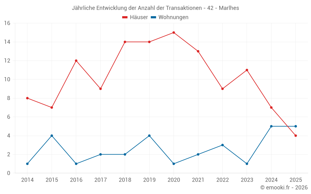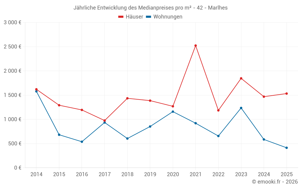 Der Durchschnittspreis auf den 17 Hausgeschäften der letzten 24 Monate in der Gemeinde Marlhes betrug 1 846 € pro Quadratmeter für einen mittleren Immobilienwert von 205 600 €. Über diesen Zeitraum hinweg lagen 60% der Transaktionen zwischen 1 407 und 2 193 € pro Quadratmeter (vom 2. bis zum 8. Dezil).