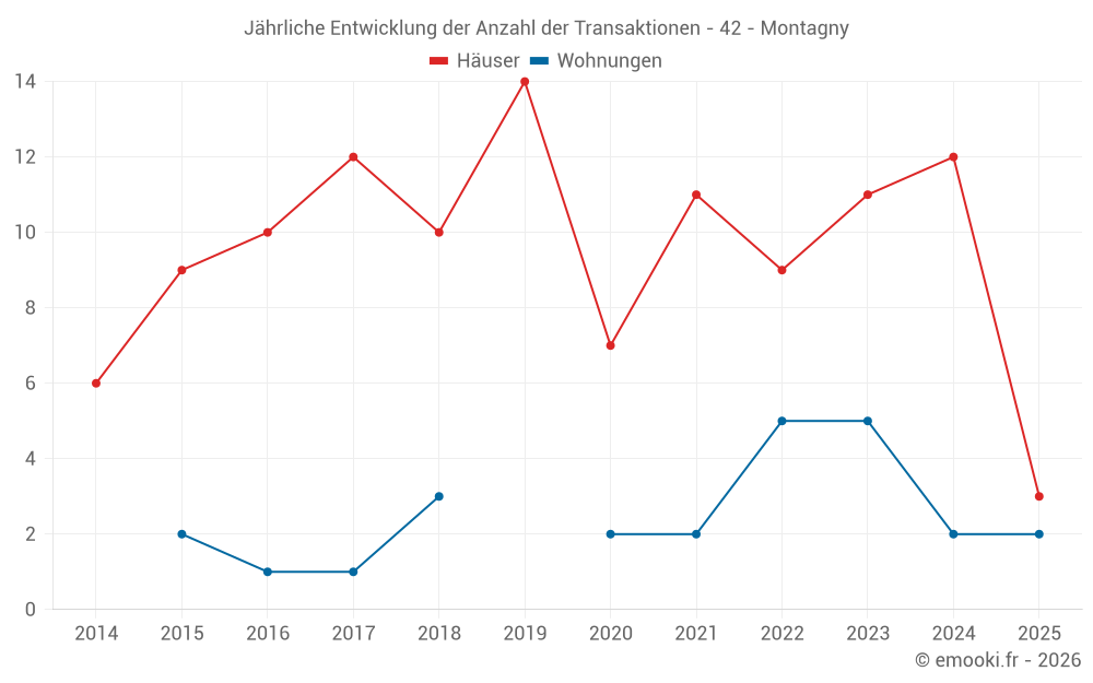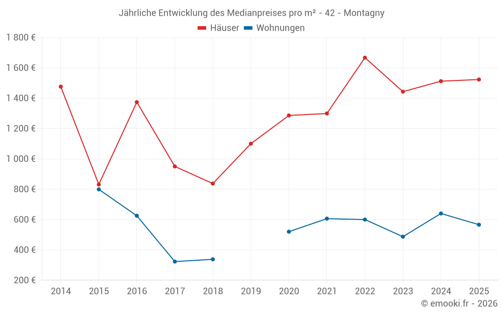 Der Durchschnittspreis auf den 19 Hausgeschäften der letzten 24 Monate in der Gemeinde Montagny betrug 1 742 € pro Quadratmeter für einen mittleren Immobilienwert von 150 000 €. Über diesen Zeitraum hinweg lagen 60% der Transaktionen zwischen 953 und 2 387 € pro Quadratmeter (vom 2. bis zum 8. Dezil).