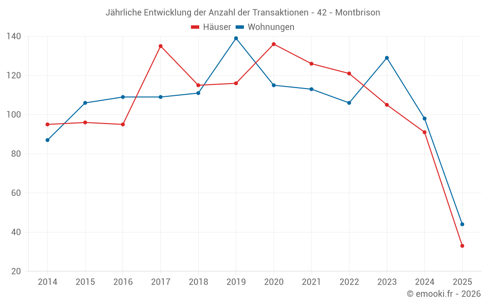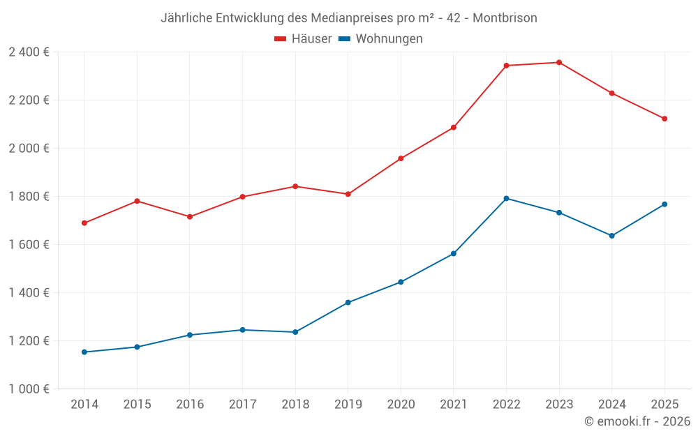 Der Durchschnittspreis auf den 33 Hausgeschäften der letzten 6 Monate in der Gemeinde Montbrison betrug 2 123 € pro Quadratmeter für einen mittleren Immobilienwert von 210 000 €. Über diesen Zeitraum hinweg lagen 60% der Transaktionen zwischen 1 745 und 2 830 € pro Quadratmeter (vom 2. bis zum 8. Dezil).